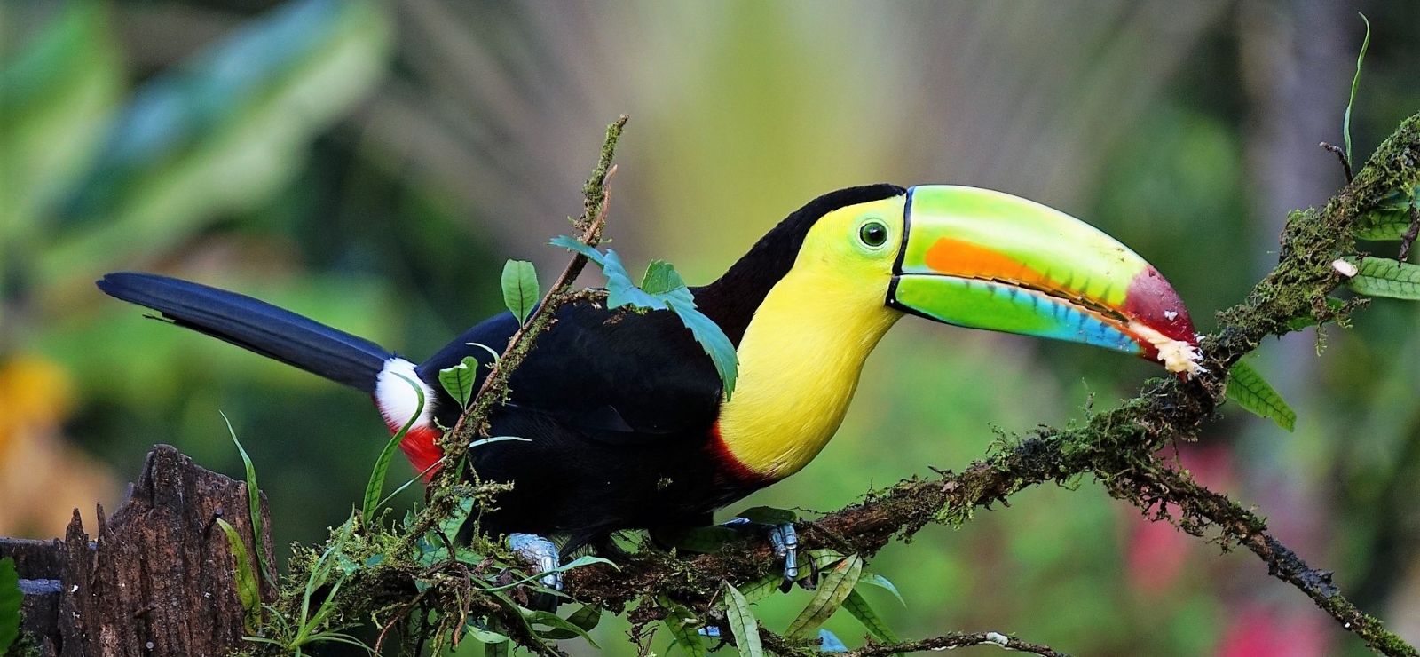 Dziób tukana przyciąga wzrok nie tylko rozmiarem, ale i intensywnymi kolorami. Tukan tęczowodzioby szczyci się całą paletą barw w tym miejscu. Może nam się wręcz wydawać, że ptak uszczknął na śniadanie kawałek tęczy!